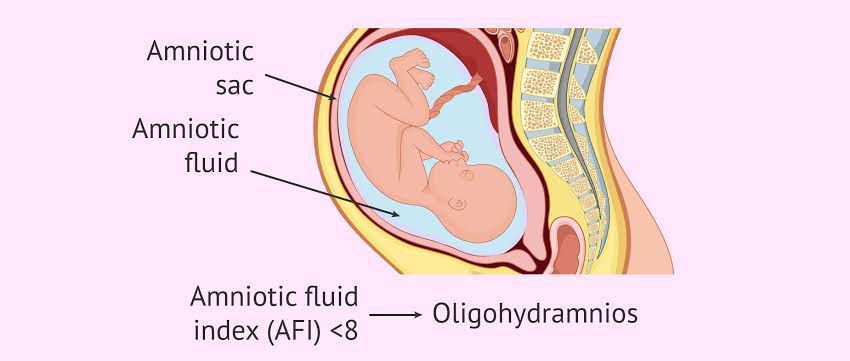 What is oligohydramnios? In this condition, there is too little amniotic fluid around your baby during pregnancy. This occurs in only about 4% of pregnancies. Your baby needs amniotic fluid to grow. This watery fluid is inside the amniotic sac (membrane).