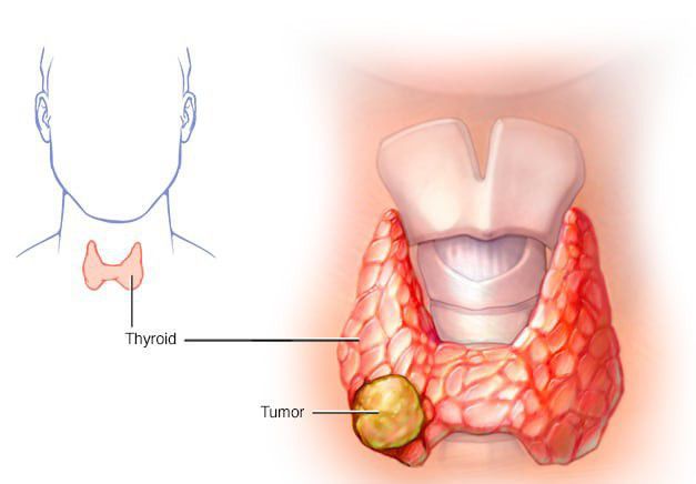 Thyroid cancer is a growth of cells that starts in the thyroid. The thyroid is a butterfly-shaped gland located at the base of the neck, just below the Adam's apple. The thyroid produces hormones that regulate heart rate, blood pressure, body temperature and weight. Thyroid cancer might not cause any symptoms at first. But as it grows, it can cause signs and symptoms, such as swelling in your neck, voice changes and difficulty swallowing.