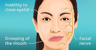 Signs and symptoms of Bell's palsy come on suddenly and may include: Rapid onset of mild weakness to total paralysis on one side of your face — occurring within hours to days Facial droop and difficulty making facial expressions, such as closing your eye or smiling Drooling Pain around the jaw or in or behind your ear on the affected side Increased sensitivity to sound on the affected side Headache A loss of taste Changes in the amount of tears and saliva you produce