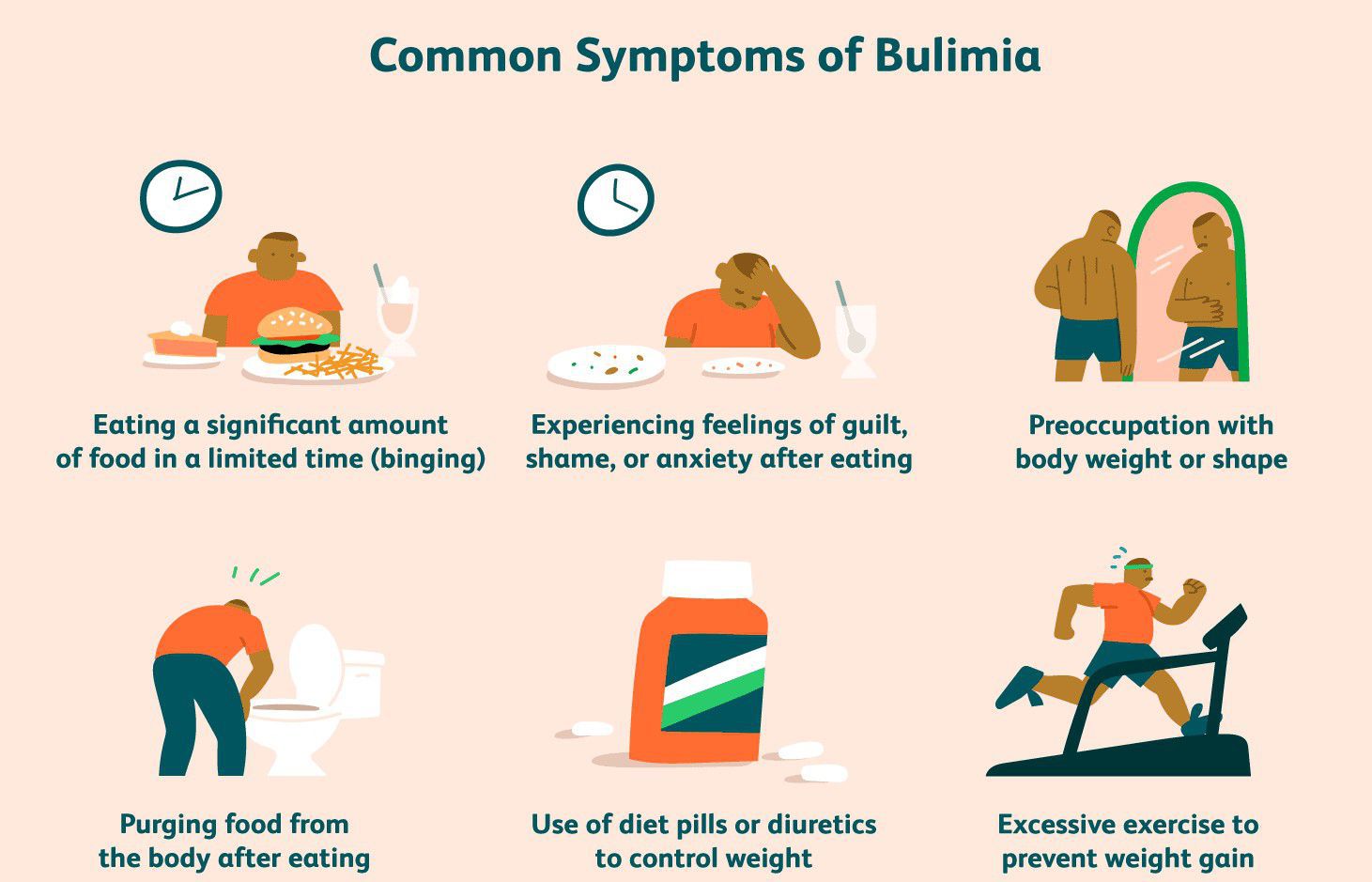 Bulimia is an eating disorder. It is characterized by uncontrolled episodes of overeating, called bingeing. This is followed by purging with methods such as vomiting or misuse of laxatives. Bingeing is eating much larger amounts of food than you would normally eat in a short period of time, usually less than 2 hours.