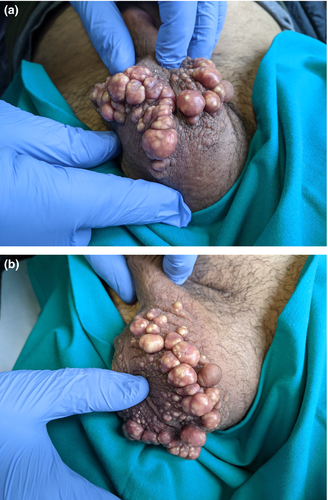 A 34-year-old Moroccan man with Fitzpatrick skin type IV presented to the sexually transmitted diseases centre with multiple painless nodules involving the scrotum. The first lesions had appeared when he was 15 years old and had increased progressively in number and size. The patient was concerned about cosmesis and discomfort; however, the condition had not interfered with sexual relations or fertility. His medical history was unremarkable. There was no history of trauma, ulcers or infections of the genital area, and the patient denied any other skin diseases. He worked as a manual labourer.