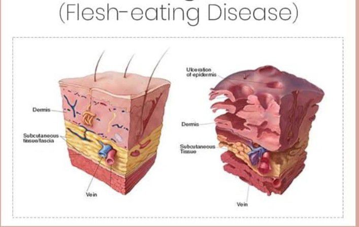 Necrotizing fasciitis (NF), also known as flesh-eating disease, is a bacterial infection that results in the death of parts of the body's soft tissue. It is a severe disease of sudden onset that spreads rapidly. Symptoms usually include red or purple skin in the affected area, severe pain, fever, and vomiting.