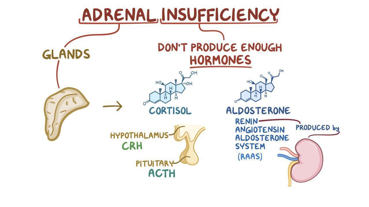 Adrenal insufficiency, including Addison's disease, is a disorder that occurs when the adrenal glands don't make enough of certain hormones. These include cortisol, sometimes called the “stress hormone,” which is essential for life.
