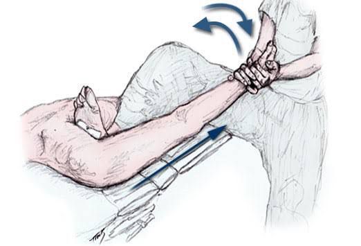 The Hippocratic method is performed with the patient lying in supine position. The practitioner holds the affected limb by the forearm and hand of the patient. The practitioner then places his heel in the axilla of the patient, acting as a fulcrum while the arm of the patient is adducted. This initiates the reduction.