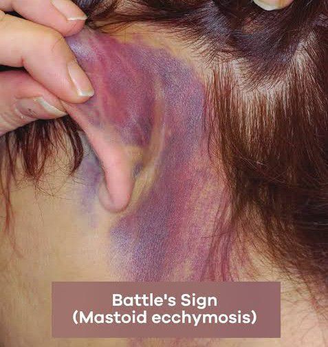 A Battle sign, or Battle's sign, is a bruise that indicates a fracture at the bottom of the skull. At first, it can look just like a typical bruise that could heal on its own. However, Battle's sign is a much more serious condition. The type of fracture that causes Battle's sign is considered a medical emergency.