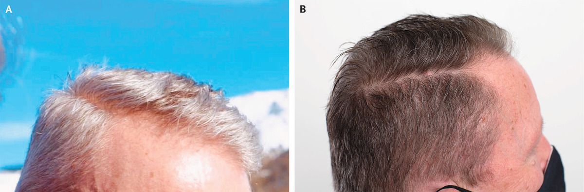 A 51-year-old man with chronic myeloid leukemia visited the oncology clinic for routine follow-up. Treatment with nilotinib, a tyrosine kinase inhibitor, had been initiated 18 months earlier. During that time, the patient had noticed, much to his delight, the gradual repigmentation of his gray hair (Panel A, photo obtained approximately 1 year before the initiation of nilotinib) to its original color. During the same period, he had not started any other new medications and had used no hair-coloring products. On physical examination, his previously gray hair was noted to have become brown (Panel B). No other changes in his hair, skin, or mucosal pigmentation were observed. Molecular testing showed a deep molecular response. A diagnosis of medication-induced hair repigmentation due to the use of a tyrosine kinase inhibitor was made. Given the response of the leukemia to treatment with nilotinib, it was continued, and the patient’s hair remained brown. Camille C.B. Kockerols, M.D. Peter E. Westerweel, M.D., Ph.D. Albert Schweitzer Hospital, Dordrecht, the Netherlands source: nejm.org