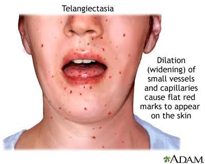 What is telangiectasia? Telangiectasias (commonly known as "spider veins") are dilated or broken blood vessels located near the surface of the skin or mucous membranes. They often appear as fine pink or red lines, which temporarily whiten when pressed