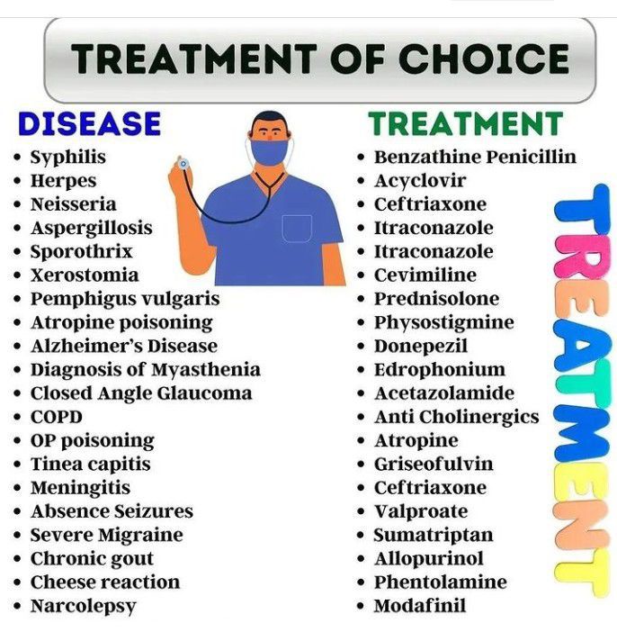 Here is an extensive list of diseases and their treatment of choice.