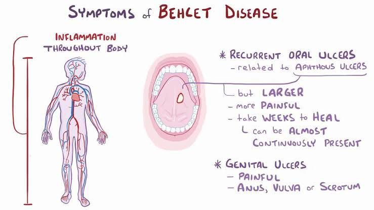 Behcet's (beh-CHETS) disease, also called Behcet's syndrome, is a rare disorder that causes blood vessel inflammation throughout your body. The disease can lead to numerous signs and symptoms that can seem unrelated at first. They can include mouth sores, eye inflammation, skin rashes and lesions, and genital sores.