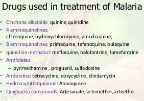 Malaria is treated with prescription drugs to kill the parasites. Other common antimalarial drugs include: Atovaquone-proguanil (Malarone) Quinine sulfate (Qualaquin) with doxycycline (Oracea, Vibramycin, others) Primaquine phosphate.
