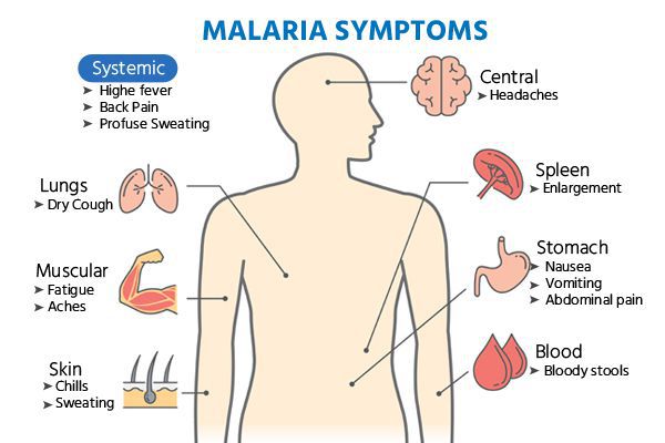 Symptoms and Diagnosis Symptoms of malaria include fever and flu-like illness, including shaking chills, headache, muscle aches, and tiredness. Nausea, vomiting, and diarrhea may also occur. Malaria may cause anemia and jaundice (yellow coloring of the skin and eyes) because of the loss of red blood cells.