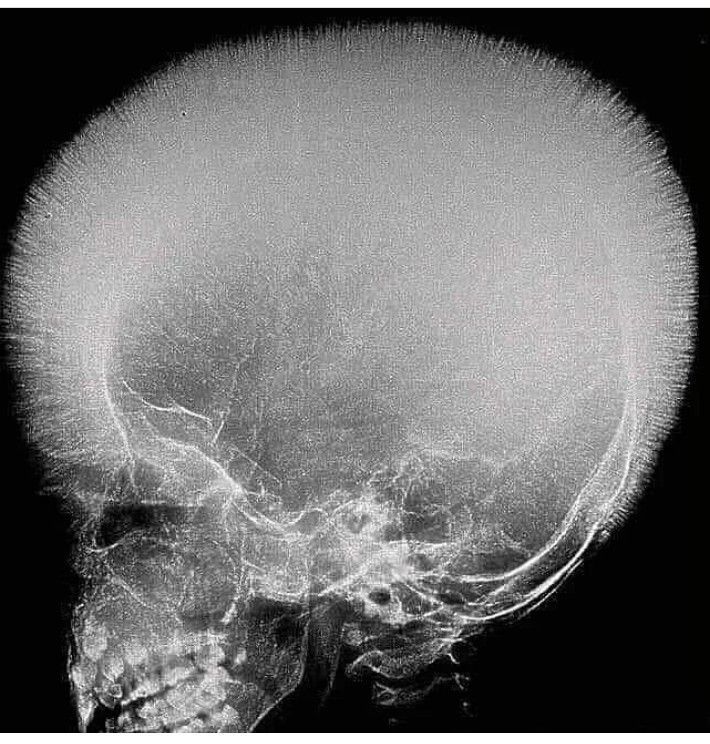 Crew cut/ Hair-on-end' sign is seen in the diploic spaces on the skull radiographs appearing like long, thin vertical striations that resemble hairs standing on ends. Hair-on-end appearance of the skull is a characteristic feature of chronic hemolysis usually seen in patients with thalassemia and sickle cell anemia.