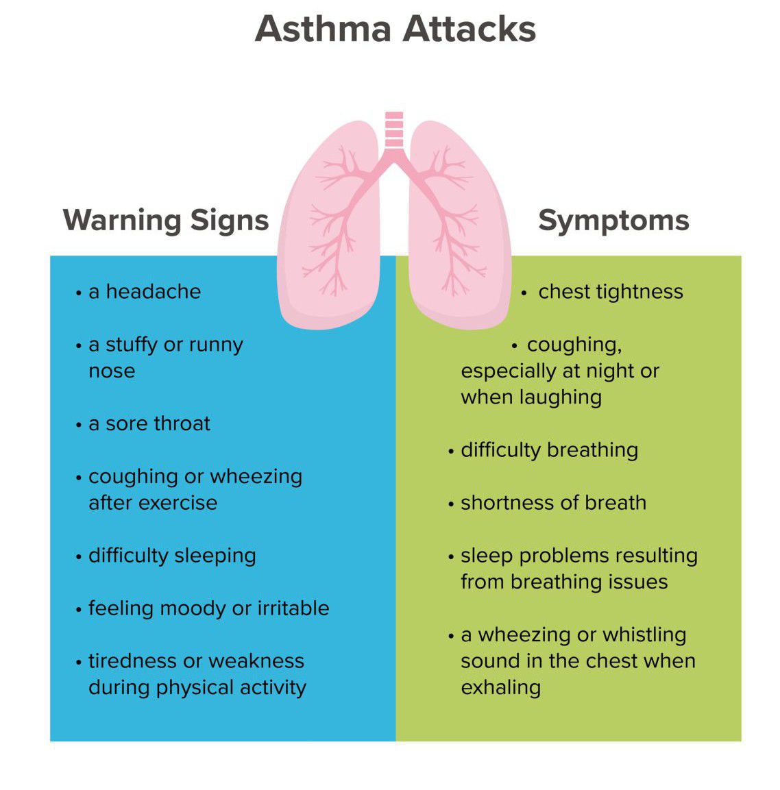 Asthma attacks 1:wheezing, coughing and chest tightness 2:becoming severe and constant. 3:being too breathless to eat, speak or sleep. 4:breathing faster. 5:a fast heartbeat. 6:drowsiness, confusion, exhaustion or 7:dizziness. 8:blue lips or fingers. 9:fainting.