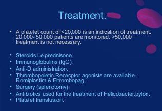 Medications to treat ITP may include: Steroids. Your doctor will likely start you on an oral corticosteroid, such as prednisone. Once your platelet count is back to a safe level, you can gradually discontinue taking the drug under the direction of your doctor.