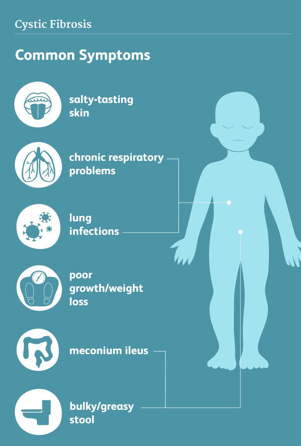 Symptoms of cystic fibrosis .recurring chest infections. .wheezing, coughing, shortness of breath and damage to the airways (bronchiectasis) .difficulty putting on weight and growing. .yellowing of the skin and the whites of the eyes (jaundice) .diarrhoea, .constipation .large, smelly poo.