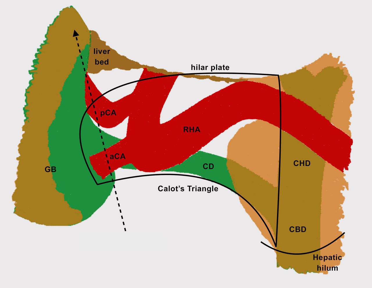 The caterpillar or Moynihan's hump configuration is characterized by a tortuous right hepatic artery (RHA) running proximal and/or parallel to the cystic duct and predisposes to a small and/or short cystic artery (CA).