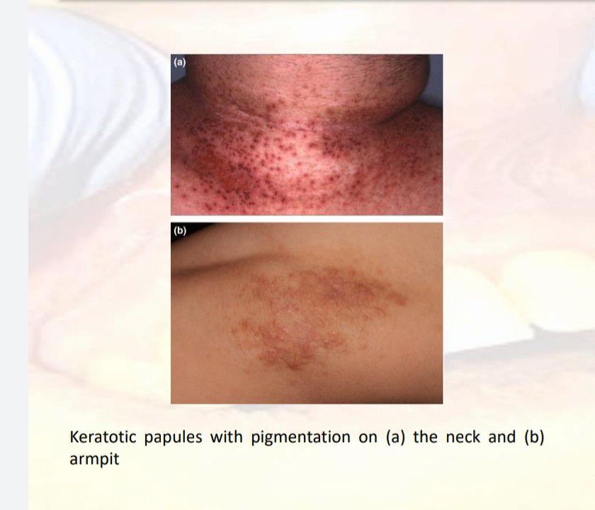 Darier disease, also known as Darier-White disease, keratosis follicularis, or dyskeratosis follicularis (MIM #124200), is a rare autosomal dominant genodermatosis characterized by a persistent eruption of red-brown, keratotic papules scattered to confluent in a seborrheic distribution, nail abnormalities, pitting of palms and soles, and mucosal changes. The disease usually starts around puberty and runs a chronic course with exacerbations induced by sun exposure, heat, friction, or infections