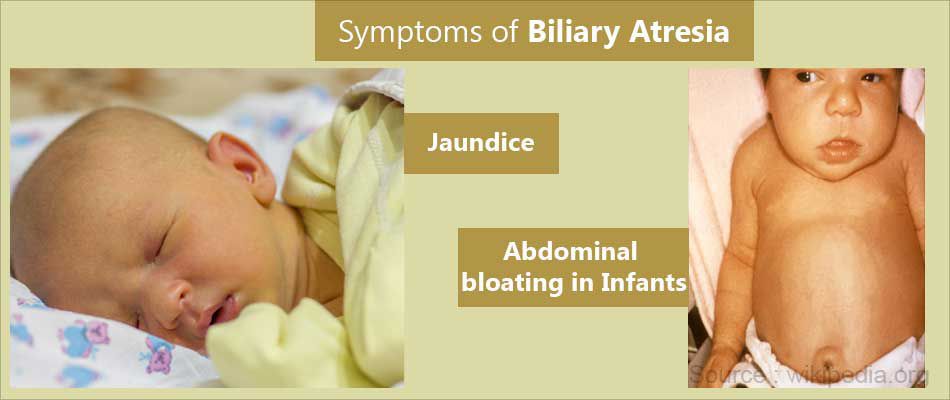 The symptoms of biliary atresia usually appear by the age of two to six weeks and include a yellowish coloration of the skin and whites of the eyes (jaundice), abnormally pale stools, and dark urine. Infants may also have swollen (distended) stomach and/or abnormal enlargement of the liver (hepatomegaly).