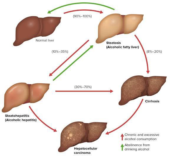 Drinking a large amount of alcohol, even for just a few days, can lead to a build-up of fats in the liver. This is called alcoholic fatty liver disease, and is the first stage of ARLD. Fatty liver disease rarely causes any symptoms, but it's an important warning sign that you're drinking at a harmful level.