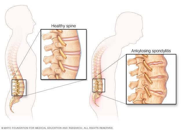 Early signs and symptoms of ankylosing spondylitis might include pain and stiffness in the lower back and hips, especially in the morning and after periods of inactivity. Neck pain and fatigue also are common. Over time, symptoms might worsen, improve or stop at irregular intervals. The areas most commonly affected are: The joint between the base of the spine and the pelvis The vertebrae in the lower back The places where tendons and ligaments attach to bones, mainly in the spine, but sometimes along the back of the heel The cartilage between the breastbone and the ribs The hip and shoulder joints