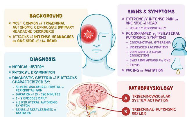 Cluster headaches are excruciating attacks of pain in one side of the head, often felt around the eye. Cluster headaches are rare. Anyone can get them, but they're more common in men and tend to start when a person is in their 30s or 40s.