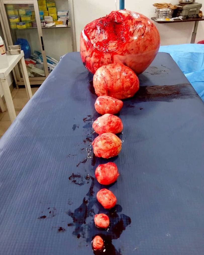 Uterine fibroids lined up from the biggest to smallest! These fibriod masses weighed 4.7kg and was found in a middle aged woman. She had the fibroid for 16 years and had taken several herbal concoctions and had been told that it will be dissolved, which wasnβt quite the case. Fibroids are also called leiomyomas. The pathogenesis is characterized by benign smooth muscle neoplasm. They can occur in any organ, but the most common forms occur in the uterus, small bowel and the esophagus. They are benign, but may lead to excessive menstrual bleeding (menorrhagia), often cause anemia and may lead to infertility. A fibroid uterus is typically firm and irregularly enlarged. Enucleation is removal of fibroids without removing the uterus (hysterectomy), which was the surgery that took place in the case above. Photo by @jebzmanchini
