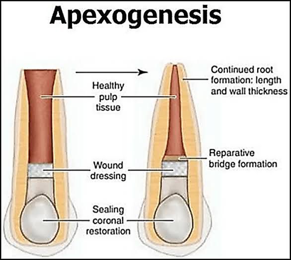 Apexogenesis is a procedure that addresses the shortcomings involved with capping the inflamed dental pulp of an incompletely developed tooth. The goal of apexogenesis is the preservation of vital pulp tissue so that continued root development with apical closure may occur.
