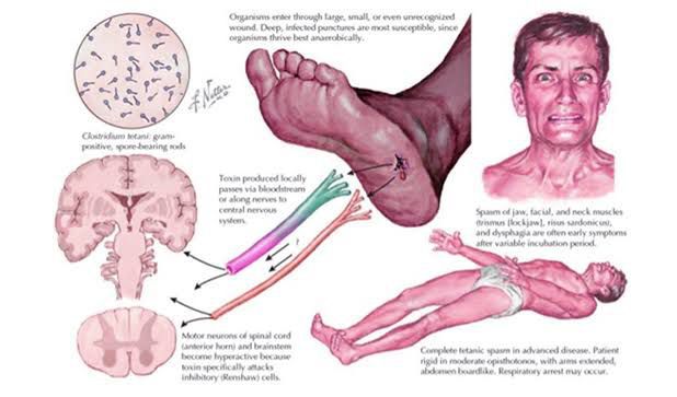 Tetanus is an infection caused by bacteria called Clostridium tetani. When the bacteria invade the body, they produce a poison (toxin) that causes painful muscle contractions. Another name for tetanus is “lockjaw”. It often causes a person's neck and jaw muscles to lock, making it hard to open the mouth or swallow.