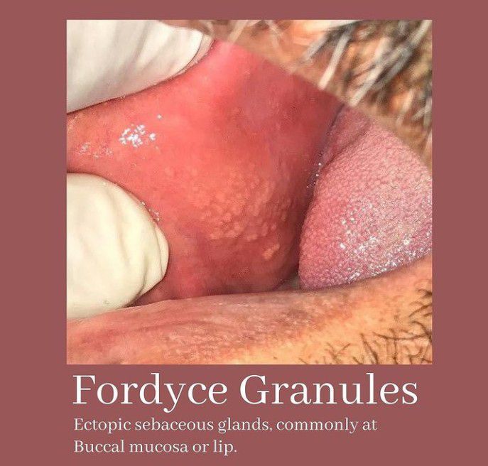 Fordyce spots, also called Fordyce granules, are small pimple-like structures that commonly form on the body. They're seen most often on male genitalia, especially around the shaft and testicles, but can be found on the lips and inner mouth. They're also present in female genitalia, especially around the labia.