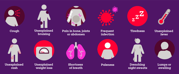 •Weight loss that is unexplained. •Bruising or bleeding that is unexplained. •Lumps or swellings. •Shortness of breath (breathlessness) •Drenching night sweats. •Infections that are persistent, recurrent or severe. •Fever (38°C or above) that is unexplained. •Rash or itchy skin that is unexplained.