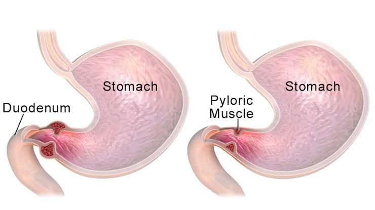 Pyloric stenosis is a thickening or swelling of the pylorus — the muscle between the stomach and the intestines — that causes severe and forceful vomiting in the first few months of life. It is also called infantile hypertrophic pyloric stenosis.
