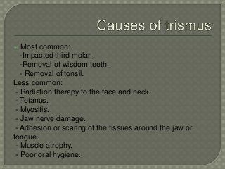 Trismus occurs when a person is unable to open their mouth more than 35 millimeters (mm) . It can occur as a result of trauma to the jaw, oral surgery, infection, cancer, or radiation treatment for cancers of the head and throat.