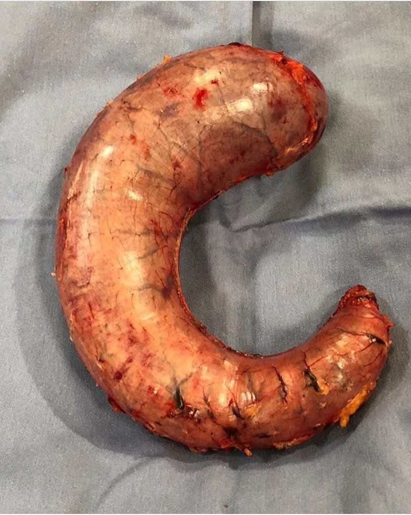 This image shows a portion of the stomach that was removed during a laparoscopic sleeve Gastronomy, which is a surgical weight loss procedure. Vertical sleeve gastrectomy is surgery to help with weight loss. The surgeon removes a large portion of your stomach. About 75% of the stomach was removed in this case by a resection along the greater curvature, leaving a narrow gastric tube or 'sleeve.' The intestines are not removed or bypassed during this procedure. The new, smaller stomach is about the size of a banana. It limits the amount of food that the patient can eat by allowing the patient to feel full after eating small amounts of food. Tag a friend who is interested in a career as a surgeon! .