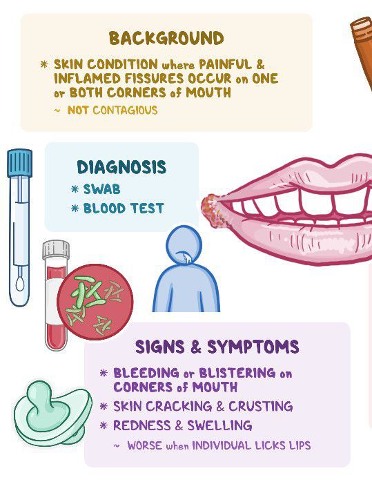 symptoms at the corners of your mouth: Bleeding. Blisters. Cracking. Crusting. Maceration (soggy, lighter-colored skin). Redness. Swelling.