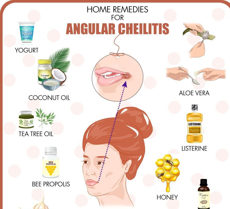 Your treatment plan depends on the cause of the angular cheilitis. It may include: Antibiotics: Oral (by mouth) or topical (on the skin) antibiotics treat bacterial infections. Dental work: Dentures or other mouth hardware should fit correctly. Misaligned teeth or a bite may improve with braces, retainers or headgear. Dietary changes: Eating foods rich in protein, iron and B vitamins can clear up problems caused by a poor diet or lack of nutrients. Ointments or creams: Antifungal creams or topical steroids relieve swelling and pain from cracked corners of the mouth. Lip balm or petroleum jelly can keep your mouth moisturized and protected