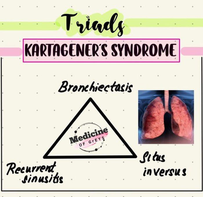 Kartagener's syndrome is a rare, autosomal recessive genetic ciliary disorder comprising the triad of situs inversus, chronic sinusitis, and bronchiectasis. The basic problem lies in the defective movement of cilia, leading to recurrent chest infections, ear/nose/throat symptoms, and infertility.