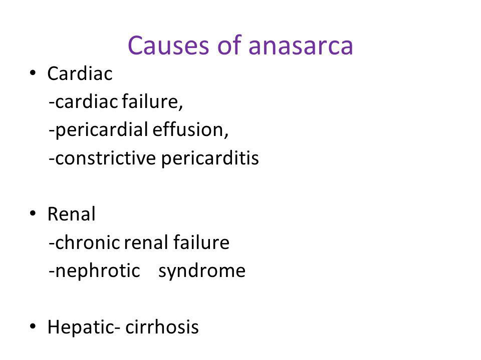 The most common causes of anasarca seen by the clinician are heart failure, cirrhosis, renal failure, and pregnancy. Other causes of anasarca are venous obstruction, burns, trauma, malignancy etc.