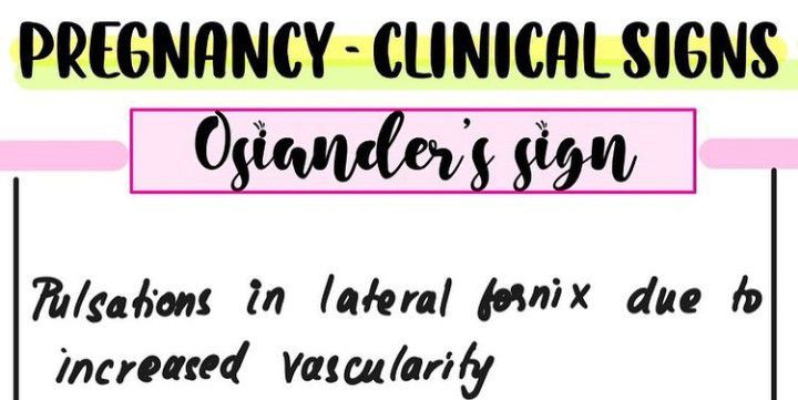 Osiander's sign is an early indication of pregnancy (at eight weeks) in which pulsation can be felt through the lateral vaginal fornix.