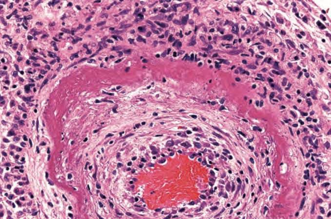 Fibrinoid necrosis is a specific pattern of irreversible, uncontrolled cell death that occurs when antigen-antibody complexes are deposited in the walls of blood vessels along with fibrin. It is common in the immune-mediated vasculitides which are a result of type III hypersensitivity.