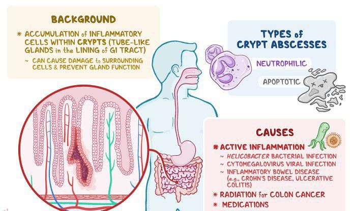 Crypt abscesses are the accumulation of inflammatory cells within the crypts of the gastrointestinal tract. There are two types of crypt abscesses: neutrophilic and apoptotic. The main causes of crypt abscesses, including infections and inflammatory bowel disease, involve acute inflammation.