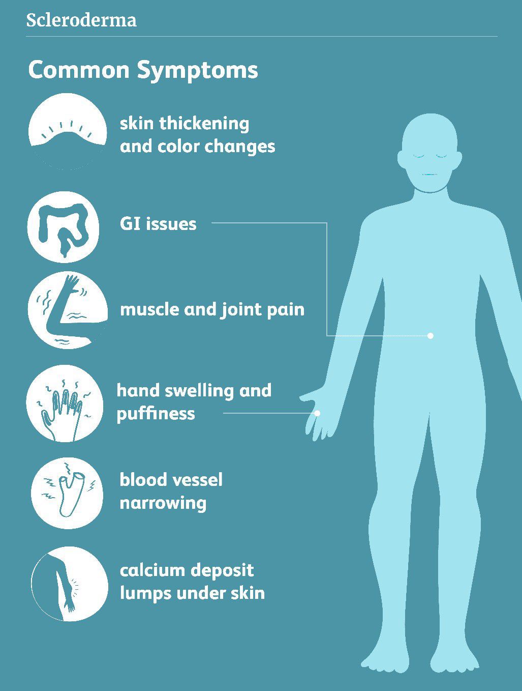 Scleroderma: Signs and symptoms Hard, thickening, or tight skin. This trait is what gives scleroderma its name. ... Hair loss and less sweating. ... Dry skin and itch. ... Skin color changes. ... Salt-and-pepper look to the skin. ... Stiff joints and difficulty moving them. ... Muscle shortening and weakness. ... Loss of tissue beneath the skin.