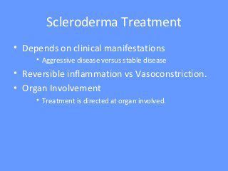 Treating Scleroderma Getting pain relief through nonsteroidal, anti-inflammatory medications or corticosteroids. Easing skin itchiness with skin lotions and moisturizers. Slowing skin thickening and minimizing damage to the internal organs with medication that suppresses the immune system