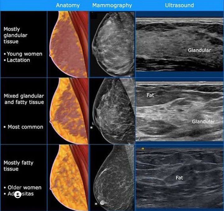 Here you can appreciate different views of breast tissue on different types of imaging.
