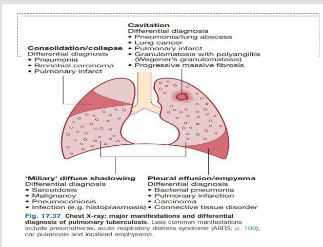 Here you can see the major manifestations and differential diagnosis of Pulmonary tuberculosis interpreted on chest X-ray.