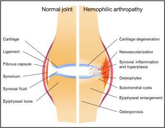 Hemophilia that leads to disability.It is caused by repeated bleeding into the same joint, and over time results in the destruction of the cartilage and synovium (the lining of the joint).