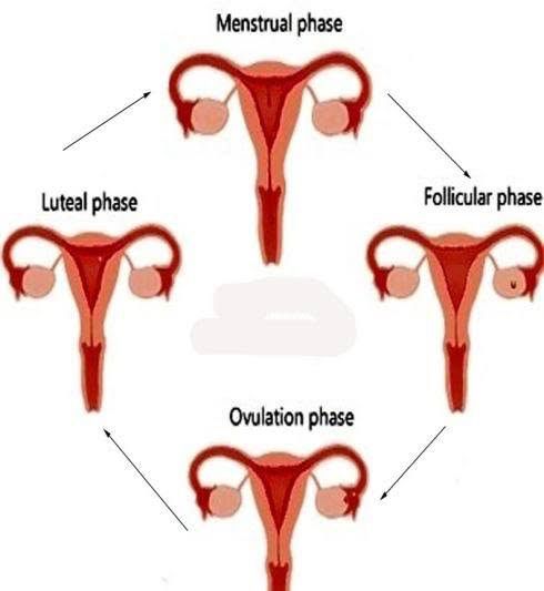 A woman’s menstrual cycle is divided into four phases: menstrual phase follicular phase ovulation phase luteal phase The length of each phase can differ from woman to woman, and it can change over time. Menstrual phase The menstrual phase is the first stage of the menstrual cycle. It’s also when you get your period. This phase starts when an egg from the previous cycle isn’t fertilized. Because pregnancy hasn’t taken place, levels of the hormones estrogen and progesterone drop. The thickened lining of your uterus, which would support a pregnancy, is no longer needed, so it sheds through your vagina. During your period, you release a combination of blood, mucus, and tissue from your uterus. You may have period symptoms like these: cramps (try these home remedies) tender breasts bloating mood swings irritability headaches tiredness low back pain On average, women are in the menstrual phase of their cycle for 3 to 7 days. Some women have longer periods than others. Follicular phase The follicular phase starts on the first day of your period (so there is some overlap with the menstrual phase) and ends when you ovulate. It starts when the hypothalamus sends a signal to your pituitary gland to release follicle-stimulating hormone (FSH). This hormone stimulates your ovaries to produce around 5 to 20 small sacs called follicles. Each follicle contains an immature egg. Only the healthiest egg will eventually mature. (On rare occasions, a woman may have two eggs mature.) The rest of the follicles will be reabsorbed into your body. The maturing follicle sets off a surge in estrogen that thickens the lining of your uterus. This creates a nutrient-rich environment for an embryo to grow. The average follicular phaseTrusted Source lasts for about 16 days. It can range from 11 to 27 days, depending on your cycle. Ovulation phase Rising estrogen levels during the follicular phase trigger your pituitary gland to release luteinizing hormone (LH). This is what starts the process of ovulation. Ovulation is when your ovary releases a mature egg. The egg travels down the fallopian tube toward the uterus to be fertilized by sperm. The ovulation phase is the only time during your menstrual cycle when you can get pregnant. You can tell that you’re ovulating by symptoms like these: a slight rise in basal body temperature thicker discharge that has the texture of egg whites Ovulation happens at around day 14 if you have a 28-day cycle — right in the middle of your menstrual cycle. It lasts about 24 hours. After a day, the egg will die or dissolve if it isn’t fertilized. Luteal phase After the follicle releases its egg, it changes into the corpus luteum. This structure releases hormones, mainly progesterone and some estrogen. The rise in hormones keeps your uterine lining thick and ready for a fertilized egg to implant. If you do get pregnant, your body will produce human chorionic gonadotropin (hCG). This is the hormone pregnancy tests detect. It helps maintain the corpus luteum and keeps the uterine lining thick. If you don’t get pregnant, the corpus luteum will shrink away and be resorbed. This leads to decreased levels of estrogen and progesterone, which causes the onset of your period. The uterine lining will shed during your period. During this phase, if you don’t get pregnant, you may experience symptoms of premenstrual syndrome (PMS). These include: bloating breast swelling, pain, or tenderness mood changes headache weight gain changes in sexual desire food cravings trouble sleeping The luteal phase lasts for 11 to 17 days. The average lengthTrusted Source is 14 days.