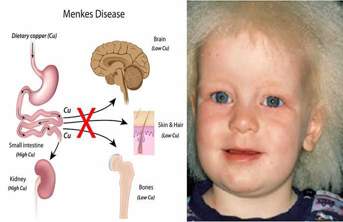 Menkes disease occurs mostly in male infants and is characterized by coarse, kinky hair (lead to its nickname of “kinky hair disease”), as well as failure to grow and thrive. Menkes disease is believed to occur in about 1 in 35,000 live male births.