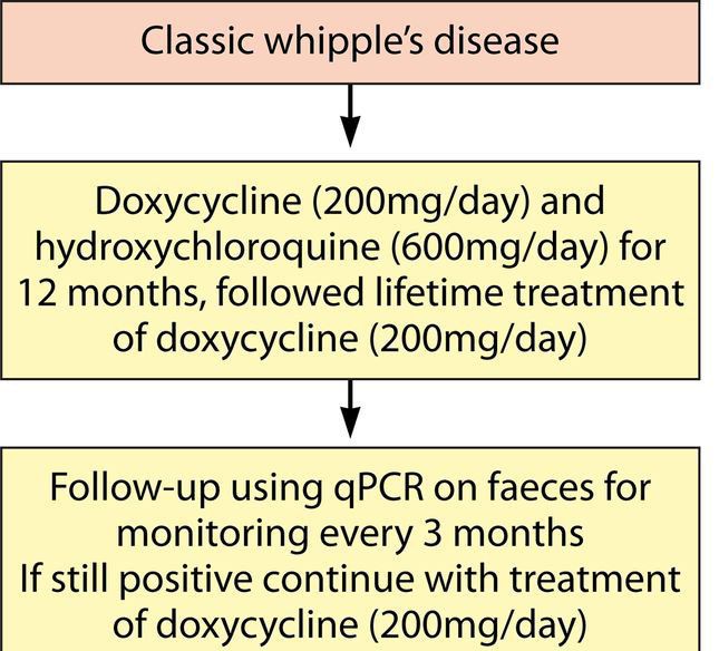 Treatment for standard cases In most cases, Whipple disease therapy begins with two to four weeks of ceftriaxone or penicillin given through a vein in your arm. Following that initial therapy, you'll likely take an oral course of sulfamethoxazole-trimethoprim (Bactrim, Septra) for one to two years