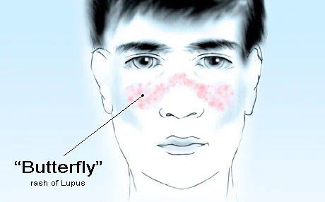 Malar rash, also named a butterfly rash, is a common facial presentation of multiple disorders. It is characterized by an erythematous flat or raised rash across the bridge of the nose and cheeks, which usually spares nasolabial folds. It may be transient or progress to involve other areas of facial skin.