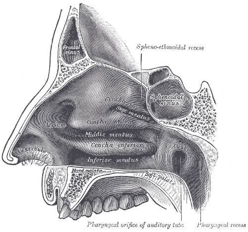 The inferior nasal meatus is the largest of the spaces in the nasal cavity that lies beneath the inferior nasal concha and the lateral nasal wall. It is responsible for the majority of airflow direction, humidification, heating and filtering of air inhaled through the nose.